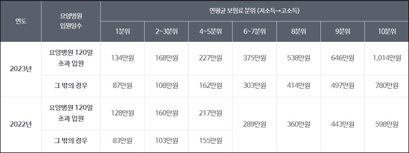 연평균 보험료 분위를 통해서 내가 받게되는 본인부담상한액 초과금을 예상해 볼 수 있는데 22년 1 분위 기준으로 예를 들어봤을 때 83만 원은 본인부담 상한액이고 128만 원은 요양병원 120일 초과한 장기 입원한 사람의 상한액입니다. 만약 22년 한해동안 내가 건강보험급여 의료비를 200만 원을 냈다면 200만 원에서 자기 부담상한액 83만 원을 뺀 117만 원을 본인부담상한액 초과금으로 지급받을 수 있고, 요양병원 장기입원자라면 200만 원에서 128만 원을 뺀 72만 원을 환급받게 된다고 계산할 수 있습니다.