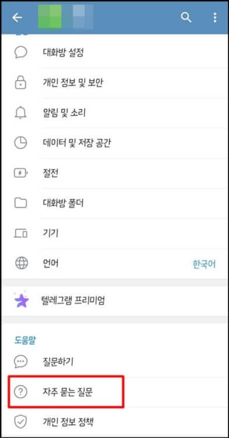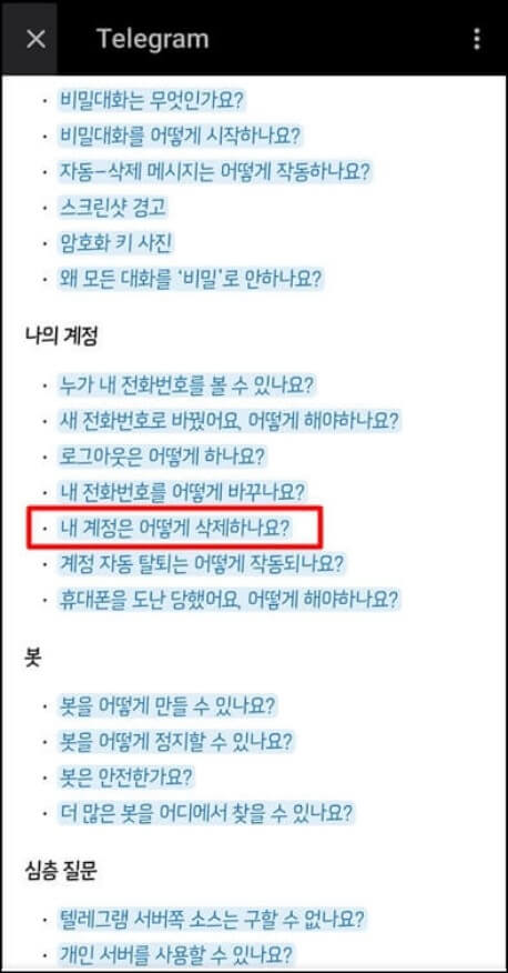 1. 텔레그램 앱 또는 PC에서 설정으로 들어가서 도움말 영역에 있는 자주 묻는 질문으로 들어가서 스크롤을 내려 나의 계정 영역에 있는 내 계정은 어떻게 삭제하나요? 라는 질문을 클릭합니다.
