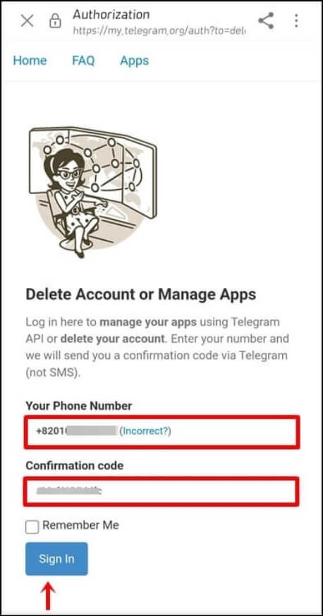 3. 입력한 번호로 웹 로그인 코드가 발송 되는데 로그인 코드를 Confirmation code 영역에 그대로 적고, Sign in 버튼을 클릭합니다. (로그인 코드는 숫자와 영어가 섞여있는 코드로 오타가 발생할 수도 있으니까 복사해서 붙여 넣기 하는 것이 좋습니다.)