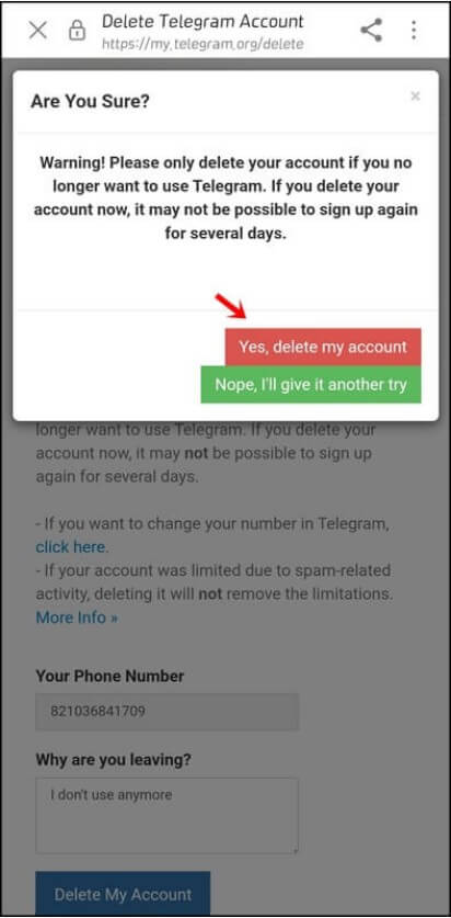 4. 다음으로 넘어가면 탈퇴하려고 묻는 질문칸이 있는데 i don't use anymore 입력하고 Yes,Delete My Account 버튼을 클릭하면 텔레그램 탈퇴가 완료됩니다. (질문칸에는 아무 말이나 적어 넣으면 됨)