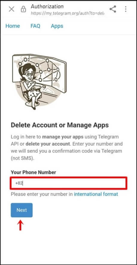 2. 이후 상단에 있는 파란색으로 표시 된 계정 비활성화를 클릭하고 텔레그램에 가입 시 사용했던 핸드폰 번호를 입력(+82 010-1234-1234)한뒤 Next 버튼을 눌러 다음으로 넘어갑니다.