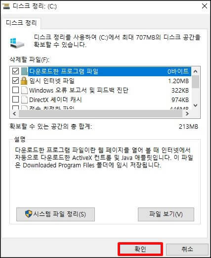 그렇게 c드라이브 속성으로 들어가서 가운데에있는 디스크 정리를 누르고 삭제할 파일 목록에서 사용하지 않는 항목들을 선택한 뒤 확인 버튼을 누르면 됩니다.