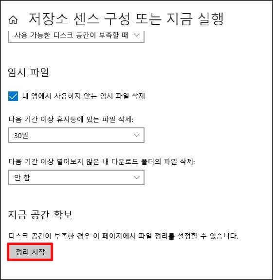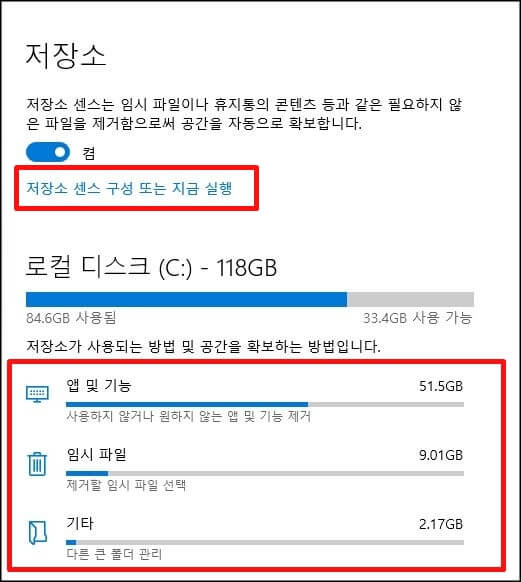 컴퓨터 저장소로 접속하면오른쪽에 항목별로 C드라이가 차지하고 있는 데이터 용량을 확인할 수 있는데 항목을 하나씩 클릭하고 세부 내용을 확인한 뒤 필요 없는 파일을 제거하거나 저장소 센스 구성 또는 지금 실행을 클릭하여 오랜 시간 동안 사용하지 않는 파일을 정리해 주면 됩니다.