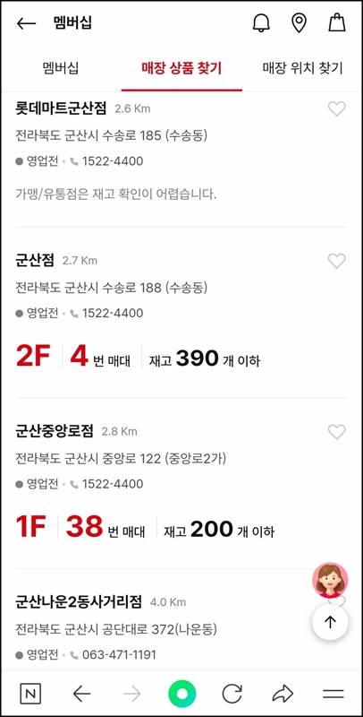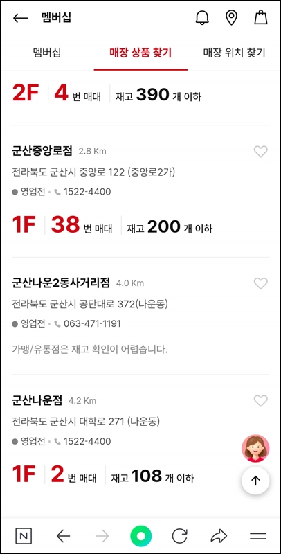 웹사이트에서와 마찬가지로 매장 상품 찾기에서 상품명이나 품번을 검색하여 매장 검색을 진행하면 됩니다.