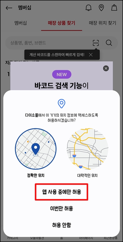 그럼 아까 웹사이트와 마찬가지로 위치정보를 허용하라는 팝업이 뜨는데요~ 앱 사용 중에만 허용을 클릭해 주고, 만약 위치정보 허용 팝업이 뜨지 않는다면 매장명을 직접 입력하여 다이소 재고조회를 하면 됩니다.