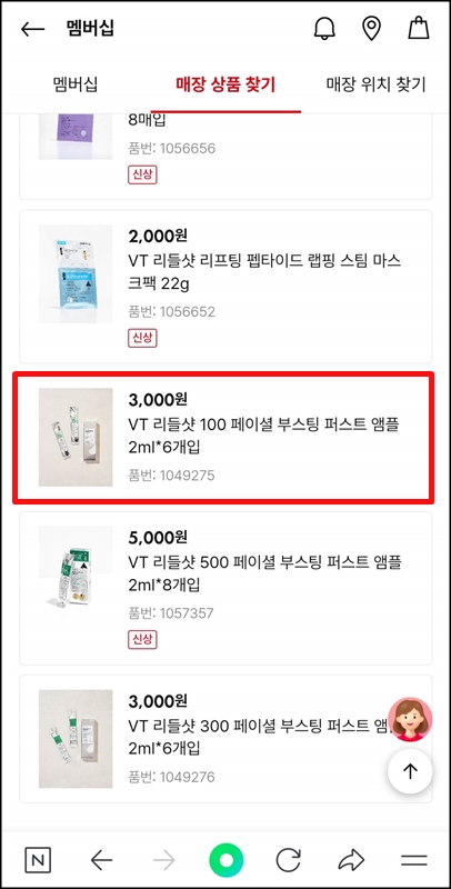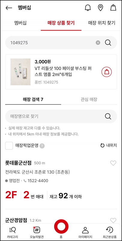 위치정보를 허용했다면 매장상품 찾기를 클릭하고 검색창에 찾고자 하는 상품의 품번이나 제품명을 입력해 검색해줍니다. 저는 한때 엄청나게 핫했던 리들샷으로 검색해 봤습니다.