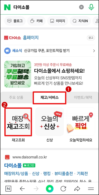 다이소 재고확인을 하기위한 첫 번째 방법은 웹사이트를 이용하는 방법입니다. 말 그대로 네이버 같은 인터넷창에 다이소몰을 검색하고 재고/서비스를 클릭한 뒤 매장 재고조회를 클릭합니다.