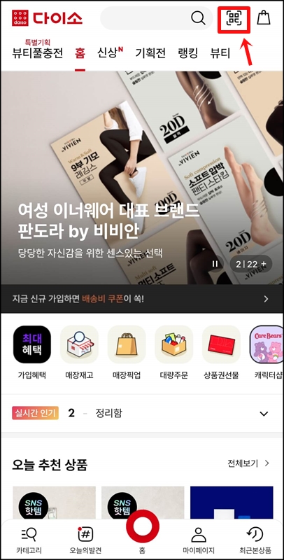 두 번째는 다이소앱을 활용하여 다이소 재고확인을 하는 방법입니다. 다이소 앱을 실행시키고 오른쪽 상단에 있는 QR코드 아이콘을 클릭해 줍니다.