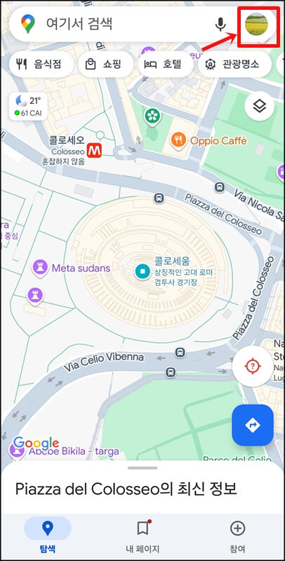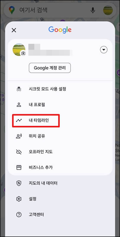 사실 구글 타임라인은 내가 다녀온 위치들을 기록해주는 서비스지만 구글 타임라인 위치추적이라는 말보다는 위치기록이라는 말이 좀 더 맞다고 볼 수 있습니다. 그렇게 내가 다녀온 구글 타임라인 위치추적을 하려면 구글 지도앱 또는 웹사이트에 접속한 뒤 구글 아이디로 로그인하고 오른쪽 상단에 있는 내 프로필 사진을 눌러 타임라인을 클릭합니다.