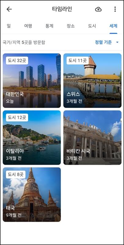 도시로 들어가면 방문한 도시에서의 방문한 장소를 한눈에 보기쉽게 카테고리별로 나누어서 보여주며 세계로 들어가면 내가 방문한 국가와 지역을 세분화해서 보여줍니다.