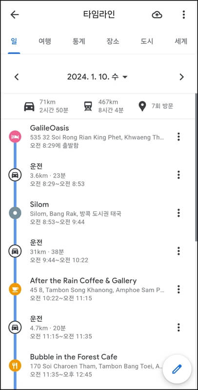 통계로 들어가면 도보로 이동한 내역과 교통수단을 활용하여 이동한 내역 그리고 방문한 곳에서 몇 시간을 있었는지 등을 확인할 수 있습니다.
