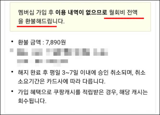 와우 멤버십에 가입한 후 당월 혜택을 이용하지 않은 상태에서 해지를 하는것이라면 1개월치 멤버십 비용이 전액 환불 됩니다. 별도의 환불 절차는 없으며 해지하기 절차를 통해 해지하면 환불이 시작되는데 평일 3~7일 이내에 승인이 취소되지만 카드사에 따라 취소 소요기간이 달라질 수도 있습니다. 단, 멤버십 요금을 결제 후 이 요금을 결제한 해당 월에 멤버십 서비스를 1회 이상 이용한 경우에는 환불이 불가하니 참고하시기 바랍니다.