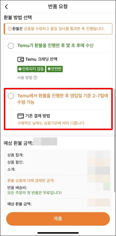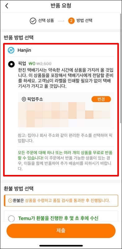 그런 다음 반품 방법과 환불 방법을 선택해야하는데요~ 반품 방법은 픽업으로 선택하고, 환불 방법은 테무 크레딧 또는 기존 결제 방식 중 선택하면 되는데 기존 결제 방식을 선택하고 진행합니다. 테무 크레딧으로 환불받게 되면 반품 요청 직후에 바로 크레딧으로 환불이 되고, 기존 결제 방법을 선택하면 영업일 기준으로 2~7일 정도가 소요됩니다.