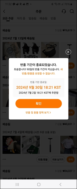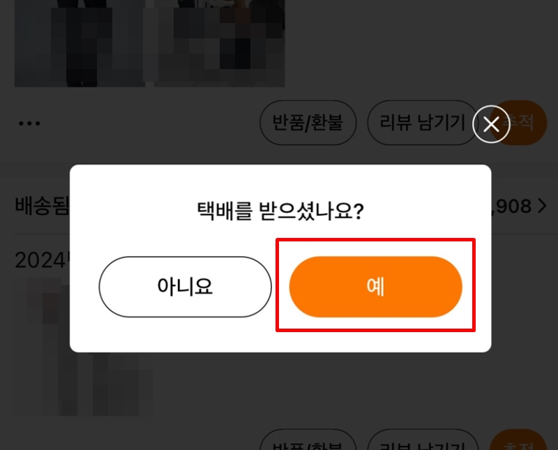 반품하려는 상품의 반품을 클릭하면 택배를 수령했냐는 팝업이 뜨는데 택배를 받은 후라면 예를 누르고 진행합니다. 만약 상품을 받기 전 반품을 진행하려고 하시는 분들은 시스템이 꼬여서 더 오래 걸리기 때문에 이왕이면 상품을 받고 반품을 진행하는 것을 추천드립니다. 테무는 90일까지 무료 반품이 가능하니까요.