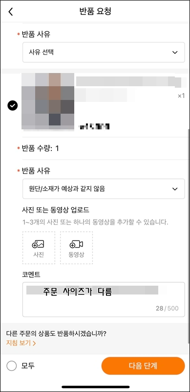 그럼 이제 반품 사유 선택을 클릭해서 10개의 사유들 중 하나를 선택하고, 사진 또는 동영상을 업로드 하거나 코멘트에 좀 더 자세한 반품 사유를 쓰면 되는데 사진이나 동영상 또는 코멘트는 굳이 첨부 및 적지 않아도 됩니다.