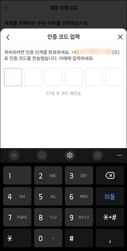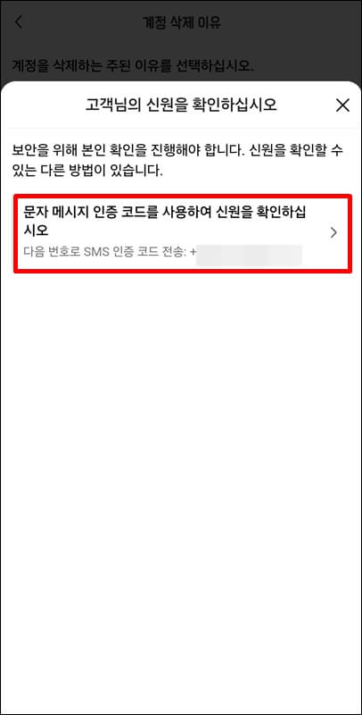 3. 나열되어있는 계정 삭제 이유들 중 하나를 선택한 뒤 본인 확인을 위해 인증코드를 사용하여 신원을 확인하십시오 라는 문구가 적혀있는 칸을 클릭합니다.
