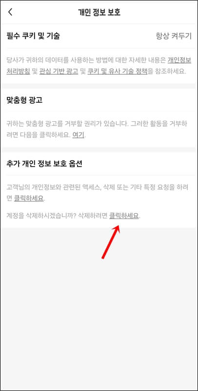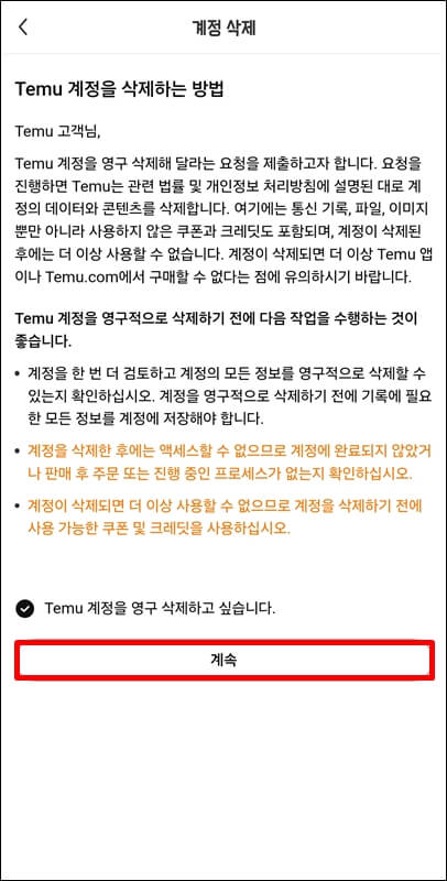 2. 그럼 맨 밑에 계정을 삭제하려면 클릭하세요라는 문구가 보일텐데요~ '클릭하세요' 문구를 클릭하고 테무 계정을 영구 삭제하고 싶다면 계속 버튼을 눌러줍니다.
