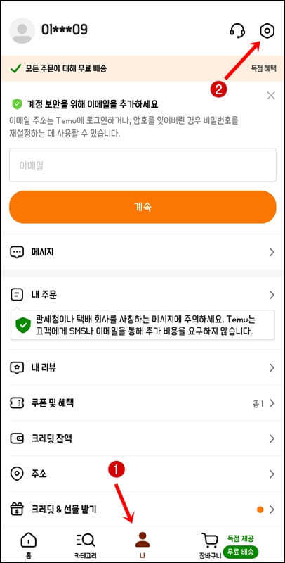 1. 테무에 연결되어있는 계정을 영구적으로 삭제하고 탈퇴하려면 로그인을 한 뒤 하단 가운데에 있는 나 > 상단 오른쪽에 있는 설정을 클릭한 뒤 개인 정보 보호로 들어갑니다.
