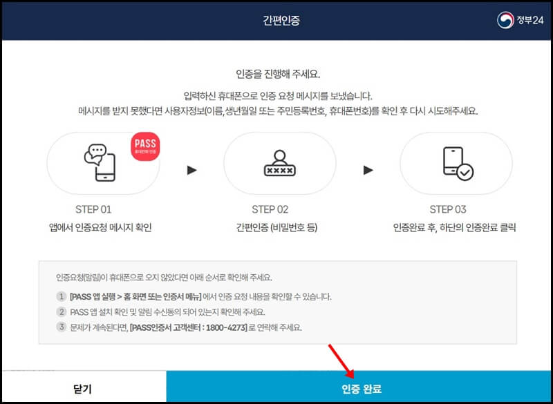 이후 원래의 정부 24 홈페이지로 다시 돌아와서 인증완료 버튼을 눌러주면 됩니다.