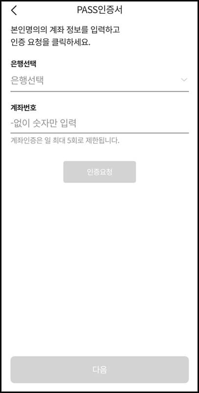 이후 인증서 발급을 위해 이름과 핸드폰번호를 입력하여 인증번호를 요청하고 문자로 전송되는 인증번호를 입력한 뒤 다음버튼을 누르고 본인명의의 은행을 하나 선택하여 계좌번호를 입력하고 인증을 요청한 뒤 계좌의 입금자명으로 찍혀있는 숫자 세 자리를 입력합니다.