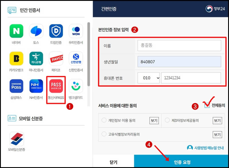 이후 민간인증서에 있는 통신사 pass앱 아이콘을 클릭하고 이름, 생년월일, 핸드폰번호를 입력한 뒤 서비스 이용에 대한 동의에 체크하고 인증요청 버튼을 누릅니다.