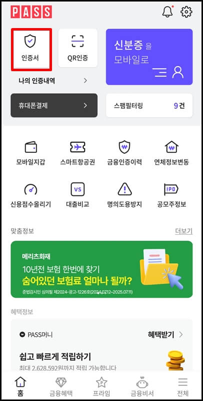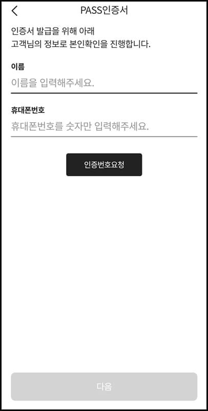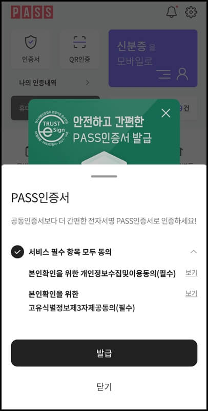 pass앱 설치를 마쳤다면 이제 pass앱 인증서 발급방법 차례입니다. pass앱을 실행하고 메인 화면 왼쪽 상단에 있는 인증서 클릭 > 인증서발급받기를 누르고 서비스 필수항목 모두에 동의한 뒤 발급 버튼을 누릅니다.