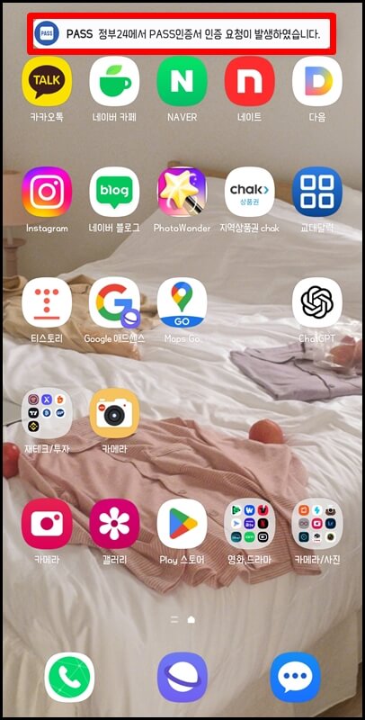 그럼 핸드폰으로 pass인증서 인증요청이 발생했다는 알림(메시지)이 오는데 그 알림을 클릭하고 제공동의에 체크한 뒤 인증 버튼을 눌러 인증서 비밀번호를 입력합니다.