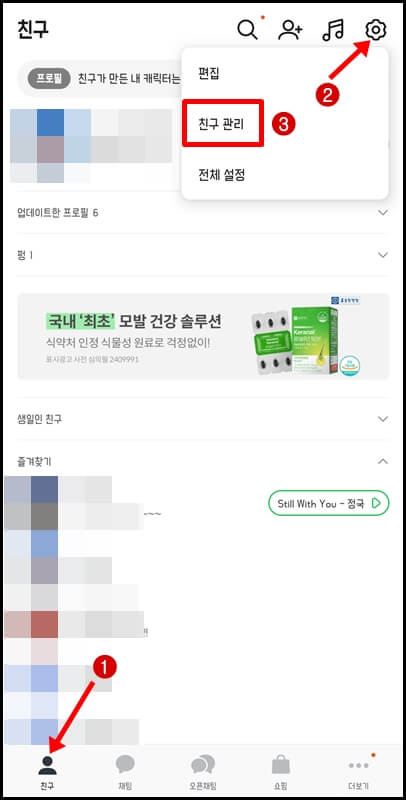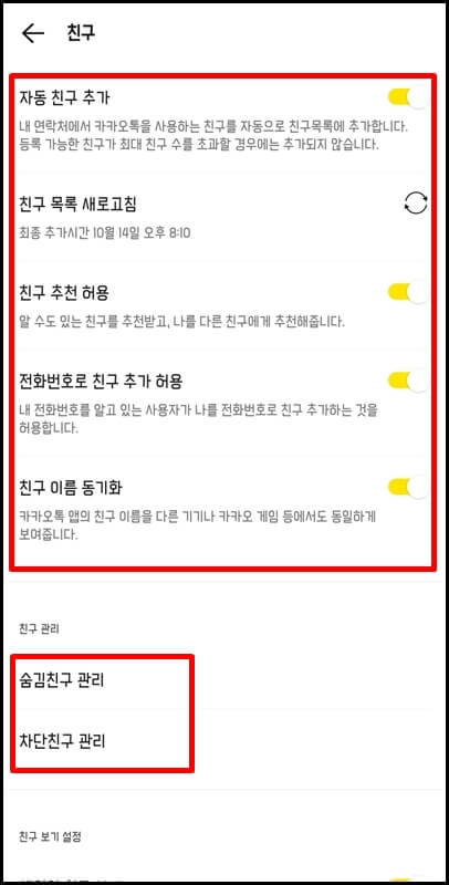 이렇게 모든 설정을 활성화해 줬는데도 여전히 카카오톡 친구추가가 안된다면 숨김친구 관리 또는 차단친구 관리로 들어가 혹시라도 숨김이나 차단을 한 게 아닌지 확인해 보는 것도 좋습니다.