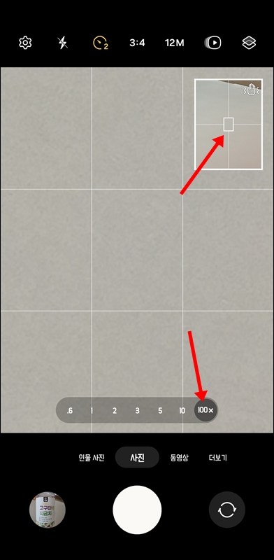 제가 현재 사용하고있는 갤럭시 s24 울트라는 기본 카메라에서 100배 줌을 지원하기 때문에 별도의 설정 없이 기본 카메라 모드로 확대해서 달사진을 찍을 수 있습니다. 보통 30배 줌을 선택했을 때부터 달의 표면의 크레이터가 보이기 시작하는데 갑자기 30배, 100배로 확대하면 달이 어디로 갔는지 카메라 화면에서 안 보이니까 30대 이상으로 확대할 때 생기는 카메라 화면 오른쪽 상단의 정사각형을 보고 달을 찾아서 작은 네모칸에 달이 쏙 들어가게끔 잘 맞춰줍니다.