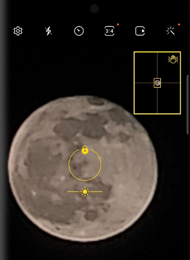이때 카메라 화면에 크게 보이는 달을 한번 터치하면 초점 고정이 실행되면서 달이 선명해지고, 오른쪽 상단에 있는 네모박스가 노란색으로 바뀌면서 손떨림 방지 기능도 실행될때 촬영을 하면 됩니다.