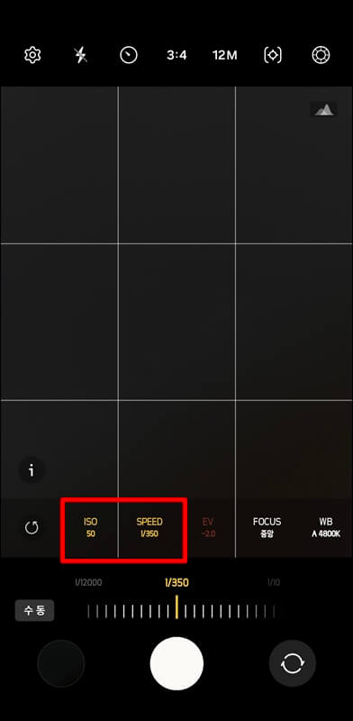 그리고 빛을 얼마나 오랫동안 센서에 노출할지 결정하는 셔터 스피드는 대부분 1/90 또는 1/60으로 찍지만 1/350으로 설정해 놓고 찍기도 하기 때문에 카메라에 담긴 달을 보면서 조절해 주면 됩니다.