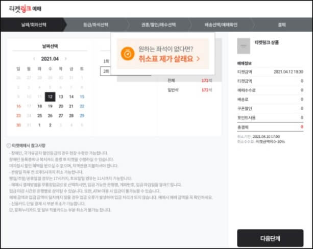 오픈 시작 8분 뒤에도 그리고 무통장 입금 취소분도 성공을 하지 못했다면 이제 마지막으로 환불표를 노려야 합니다. 공연에 따라서 예매 취소 조건을 먼저 확인하고, 취소수수료 없이 100% 환불이 되는 날 자정 5분전부터 새로고침을 계속하면 취소 자리가 간간이 나오니 참고하시기 바랍니다.