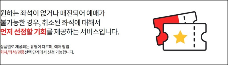 취소표대기가 가능한 공연은 위의 이미지처럼 날짜/회차 선택 단계에서 취소표 제가살래요 라는 작은 팝업이 뜨거나 좌석선택 페이지에서 원하는 좌석이 없다면?이라는 작은 팝업이 뜨면 그 팝업을 클릭하고 취소표 대기 신청을 진행하면 됩니다.