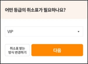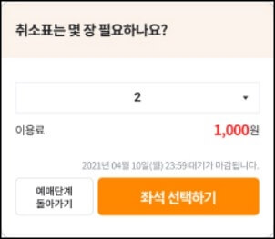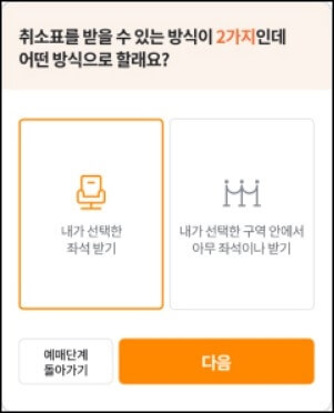 취소표 대기 팝업을 누르고 원하는 좌석을 받기위해 내가 선택한 좌석 받기 클릭 > 등급을 선택 > 필요한 취소표 장수를 선택 후 좌석선택하기 버튼을 누릅니다.