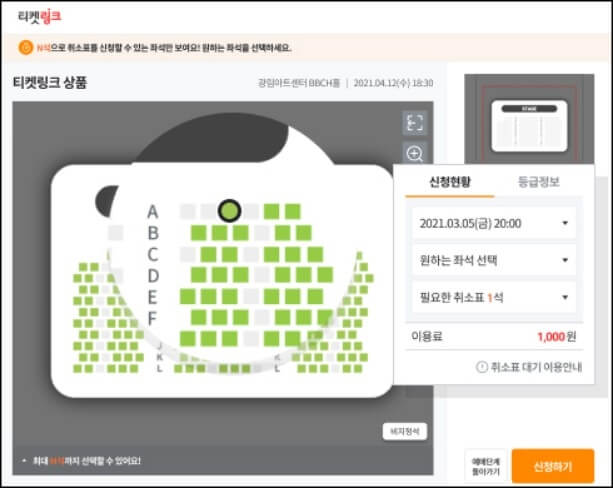 무통장입금으로 좌석을 예약해두고 더 좋은 자리를 구하거나 입금해야 되는 것을 까먹어 결제가 되지 않은 좌석들도 있습니다. 보통 예매처마다 취소표 풀리는 시간이 다르지만 무통장입금으로 인한 티켓링크 취소표 풀리는 시간은 입금 마감 기한으로부터 약 5분 ~ 7분 사이에 취소표가 풀리기 시작하니까 무통장 입금 마감 기한을 확인하는 것도 중요합니다.