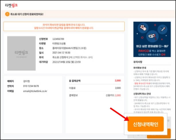 결제가 완료되면 취소표대기 신청이 완료되고 신청내역 확인하기를 누르면 마이페이지로 이동하여 취소표 대기 신청내역을 확인할수 있습니다.