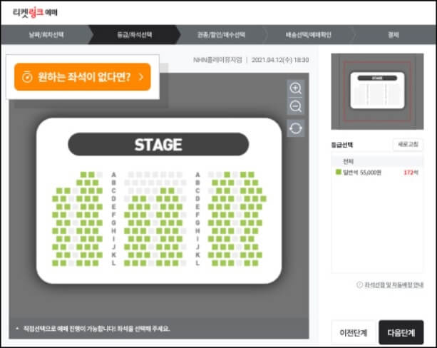 그럼 필요한 좌석수와 동일한 매수로 예매된 좌석들만 노출이 되는데요~ 보통 필요한 좌석수의 10배수(필요한 좌석을 2매로 선택했다면 20매까지 선택 가능)까지 좌석 선택이 가능하고 선택된 좌석 중에서 좌석이 확보되면 나머지 좌석들은 대기가 자동으로 취소됩니다.