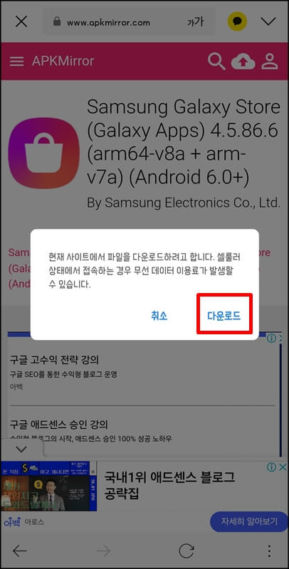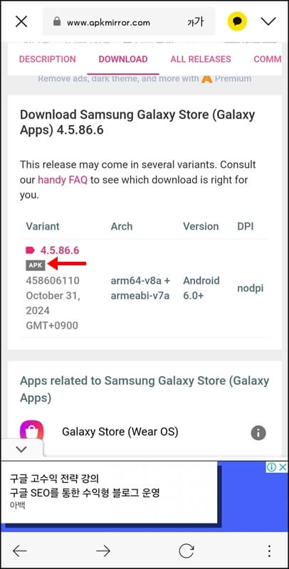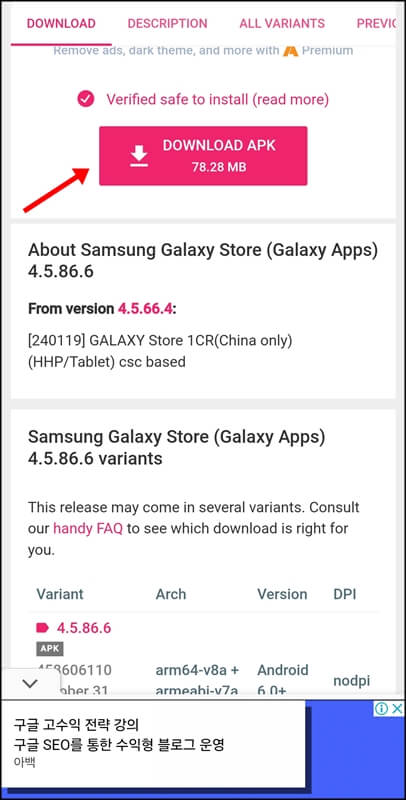 그럼 위의 이미지와 같이 안드로이드 6.0+ 버전의 갤럭시 스토어 apk 파일이 존재할 텐데요~ 여기서 작게 쓰여있는 APK 부분을 누르고, 다운로드 apk 버튼 부분을 한번 더 눌러 내 핸드폰에 해당 파일을 다운로드해줍니다. (출처를 알 수 없는 앱 설치에서 권한을 허용으로 하고 설치해야 함)
