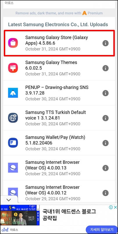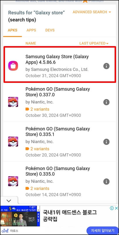 그럼 결괏값에서 삼성 갤럭시 스토어 4.5.86.6 apk 파일이 뜰 텐데요~ 이걸 누르고 들어가서 한번 더 여러 종류의 앱 상단에 있는 삼성 갤럭시 스토어 4.5.86.6을 클릭합니다. (현재는 4.5.86.6 이게 최신버전이지만 설치하는 날짜에 따라 숫자가 달라질 수 있음)