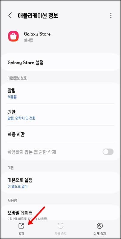 핸드폰 설정 > 애플리케이션으로 들어가서 갤럭시 스토어를 찾아 클릭한 뒤 하단에있는 열기 버튼을 눌러서 해당 앱을 활성화시켜줍니다.