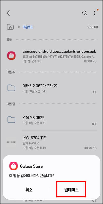 다운로드가 완료된 갤럭시 스토어 앱 apk 파일은 휴대폰에 있는 내 파일 > 다운로드에 저장이 되어있기 때문에 위의 경로로 들어가서 다운로드된 해당 파일을 찾아 클릭해서 설치를 진행해 주면 됩니다. (이미 갤럭시 스토어 설치가 되어있다면 업데이트 팝업이 뜸)