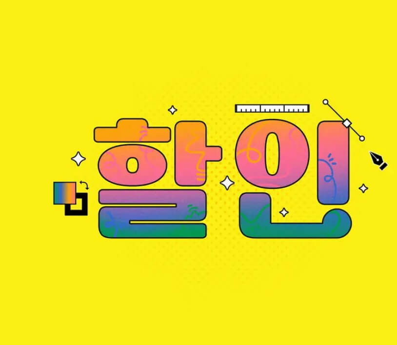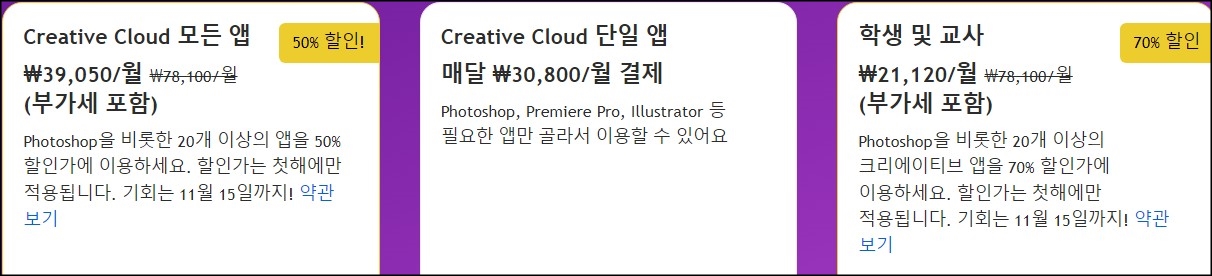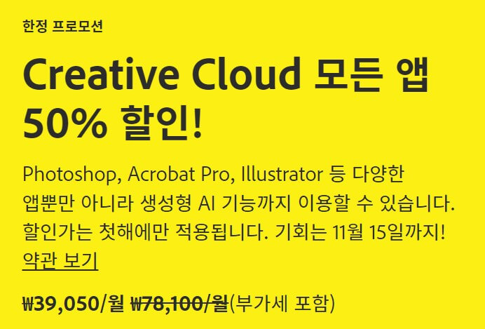 개인이 구매하는 어도비 구독 가격은 원래라면 월 78,100원이지만 50% 할인하여 1년동안은 월 39,050원에 사용할 수 있는데요~ 물론 누군가에게는 이 가격 또한 부담이 되는 가격일 수도 있지만 연간 40만 원을 아낄 수 있는 기회이기도 합니다. 심지어 학생 및 교사 같은 경우에는 무려 70%를 할인받아 월 21,120원에 이용할 수 있습니다.