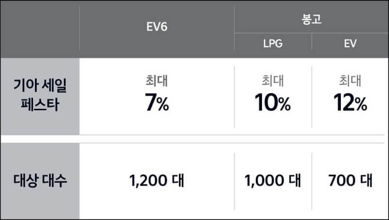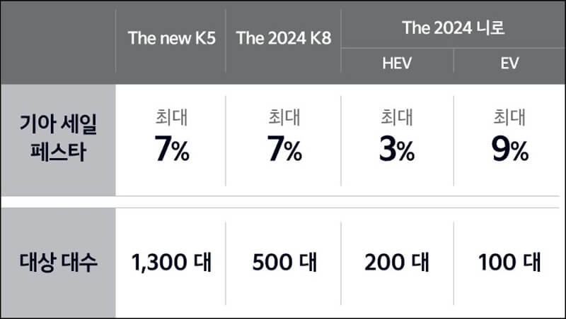 차종별 할인율을 살펴보면 더뉴 K5와 더 2024 K8 하이브리드, 더뉴 EV6는 각각 7% 할인율을 제공하고, 더 2024 니로 EV는 9% 할인율을 적용하며 1톤 트럭 봉고는 LPG 터보모델에 10%, 전기차 모델에 12%의 할인율을 제공합니다.