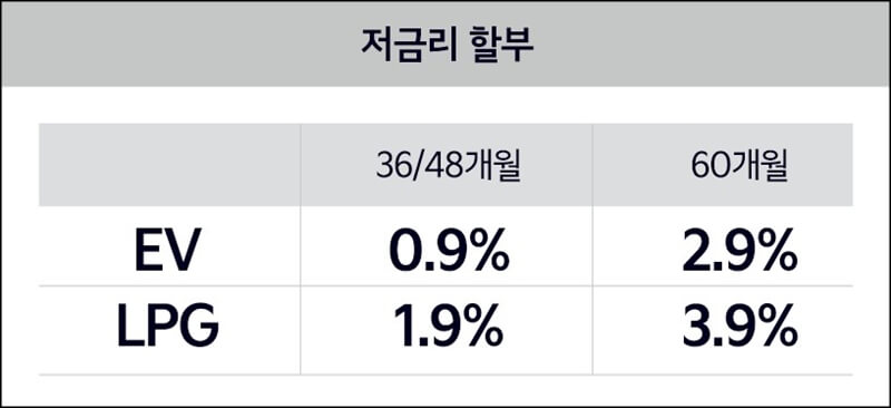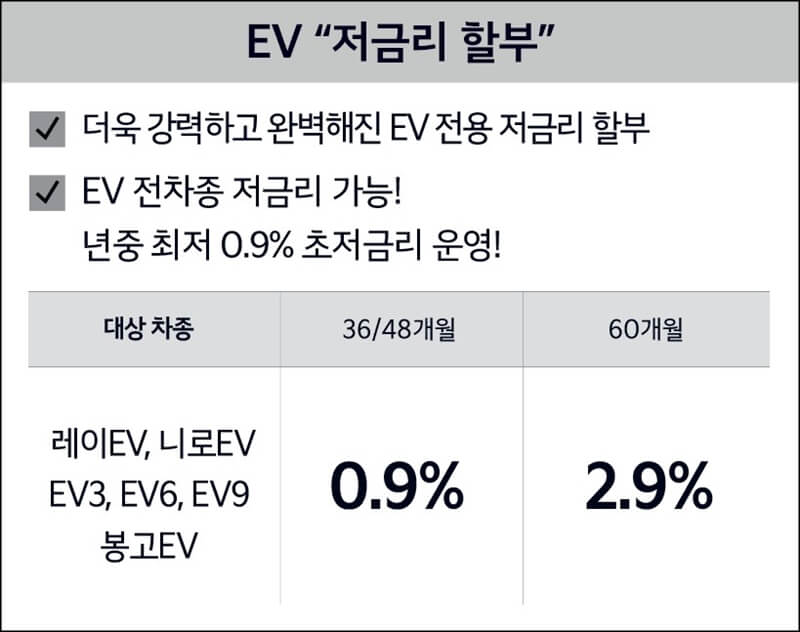여기에 다양한 저/금/리 할부 혜택도 함께 받을수 있는데요~ EV 전용 할부는 EV 출고 개인 및 개인 사업자 고객을 대상으로 하며 현대 M계열의 카드로 선수금 10% 이상의 결제가 필요합니다.