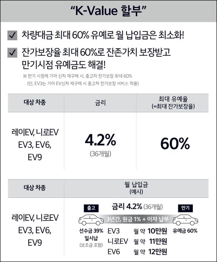 코리아 세일 페스타 기아자동차 K-Value 할부는 유예형일 경우 선수금 1% 이상의 결제가 필요한데요~ 여기에 잔가보장은 중고차 잔가보장 서비스 약정서 작성 및 할부 만기 시점에 당사의 신차를 재구매할 때 가능하니 주의하시기 바랍니다.