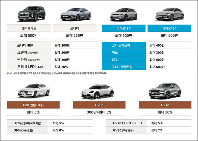 주요 차종별로는 쏘나타, 그랜저, 싼타페 등 최대 200만 원을 할인하며 하이브리드 또한 포함이 되는데요~ 펠리세이드와 아이오닉 5, 아이오닉 6은 최대 500만 원 할인이 적용되고, 파비스는 최대 1,000만 원이 할인되며 제네시스 브랜드의 차종들은 최대 7% 할인이 적용됩니다.