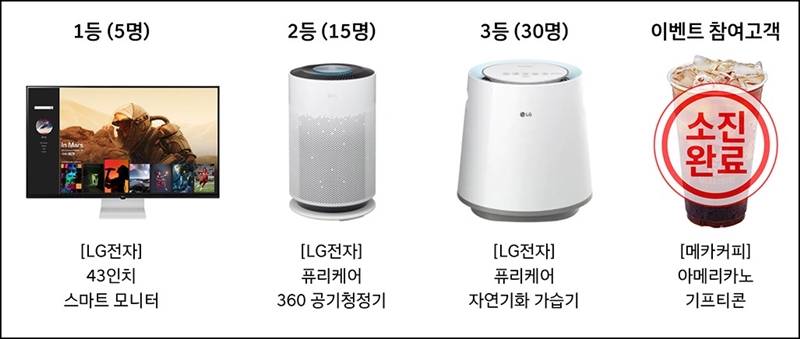 또, 코세페 현대 자동차 공식 홈페이지에서 진행중인 이벤트에 참여하면 LG 스마트 모니터와 퓨리케어 공기청정기, 퓨리케어 자연기화 가습기, 커피 기프티콘 등 경품도 지급한다고 합니다.