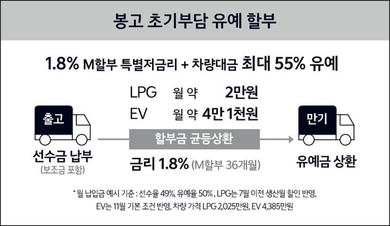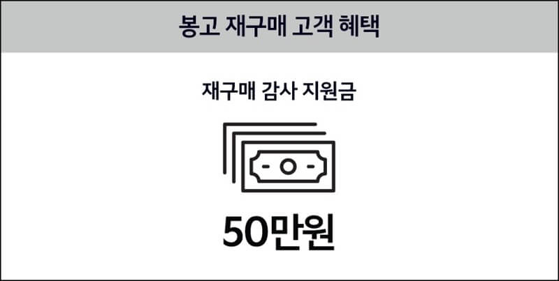 여기에 24년 11월 봉고 출구 개인/개인사업자가 다시금 봉고차를 재구매하면 재구매 감사지원금으로 50만원을 추가 할인받을 수 있습니다.