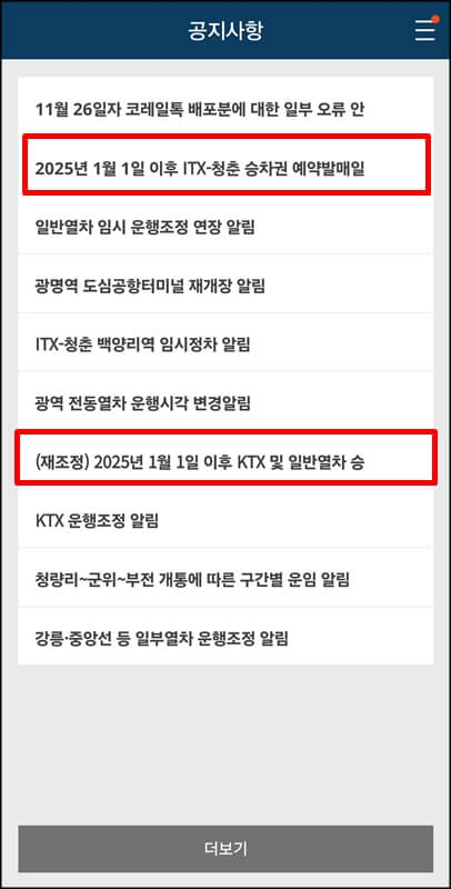 저는 기차를 자주 이용하기 때문에 코레일 앱을 활용하여 기차표 예매를 하곤 하는데요~ 코레일 앱에 접속 후 오른쪽 상단에 있는 삼선줄(메뉴)을 클릭하고 가장 상단에 있는 공지를 클릭하면 공지사항 목록으로 이동되는데 여기서 코레일 예매 오픈 일정이나 ktx 예약 오픈 시간을 확인하면 됩니다.