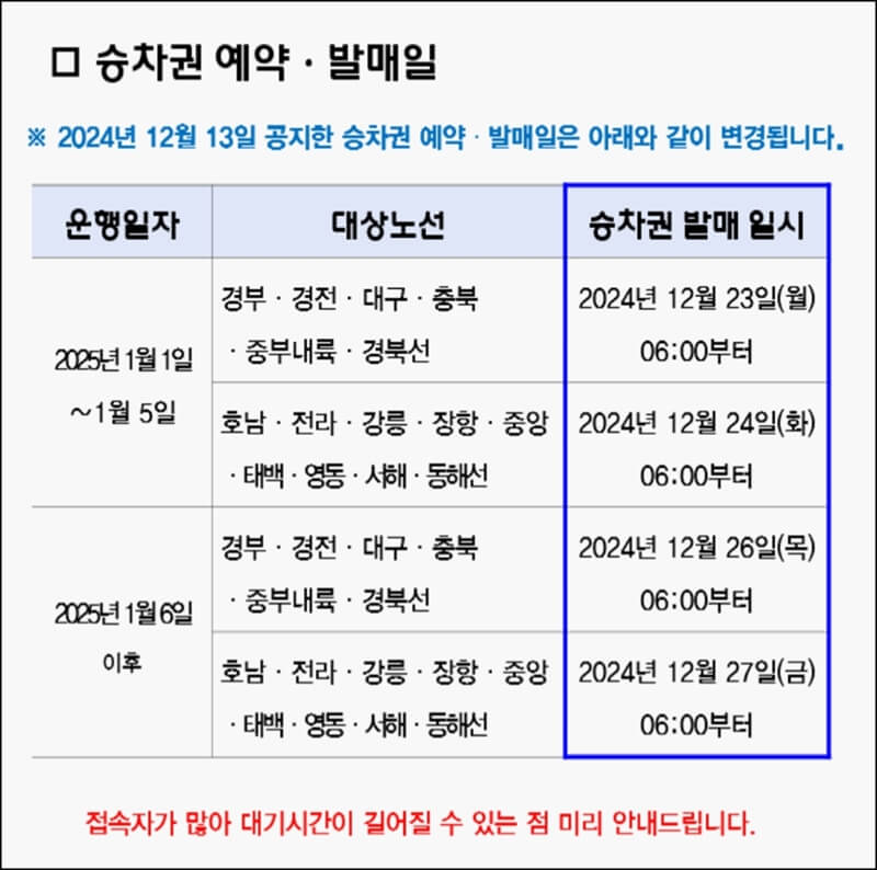 - 25년 1월 1일 ~ 1월 5일까지의 기차표는 12월 23일 ~ 24일 오전 6시부터 예매 오픈